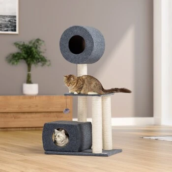Alle Katzen haben ein natürliches Kratzbedürfnis und brauchen einen geeigneten Ort für ihre Krallenpflege. Damit sich Ihre Katze gar nicht erst daran gewöhnt, ihre Krallen an Ihrem Mobiliar zu wetzen, bieten Sie ihr den AniOne Kratzbaum Padme als perfekte Alternative. Die Sisalstämme bieten Ihrer Samtpfote die Möglichkeit, sich täglichen ihrer Krallenpflege zu widmen. Der Kratzbaum von AniOne ist außerdem der ideale Rückzugsort. Die Plattform und die 2 Höhlen sind mit Polyesterfilz ummantelt und laden zum Entspannen, Schlafen und Verstecken ein.